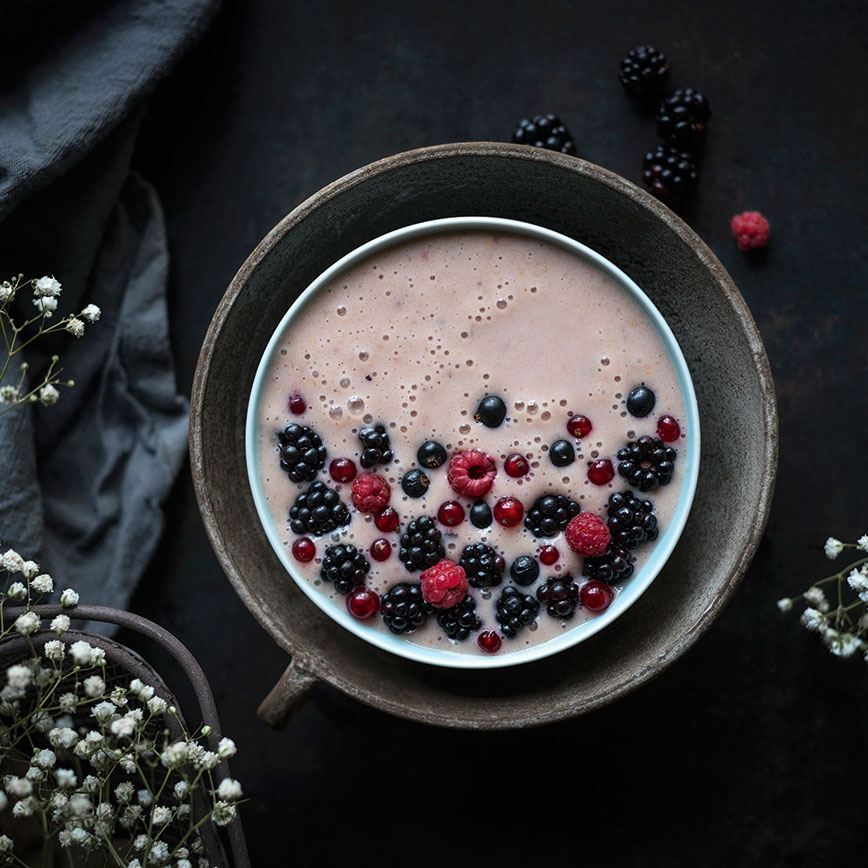 Für eine fruchtige Smoothiebowl mit Black Currant kommen 80 g schwarze Johannisbeeren (frisch oder TK) sowie je 80 g TK-Heidelbeeren, -Brombeeren und -Erdbeeren in den Mixer. Eine Banane sorgt für natürliche Süsse und Bindung, 200 g Naturjogurt oder Skyr (alternativ eine pflanzliche Jogurtbasis) für Cremigkeit. Je nach gewünschter Konsistenz 60–100 ml Milch oder Haferdrink zugeben und alles zuerst kurz, dann auf höherer Stufe cremig pürieren. Mit 1–2 TL Honig oder Ahornsirup und einem Spritzer Zitronensaft fein abschmecken, in eine Schüssel füllen und mit Beeren, Chiasamen oder gehackten Mandeln toppen.