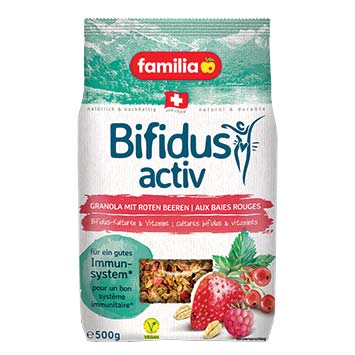 Knusper(n), das mehr kann: Das Bifidus activ Granola mit roten Beeren liefert aktive Bifidus-Kulturen, wertvolle Nahrungsfasern und essenzielle Vitamine. So bekommt Ihr Immunsystem Tag für Tag genussvolle Unterstützung. familia Bifidus Activ Granola mit roten Beeren, 500 g 6.95