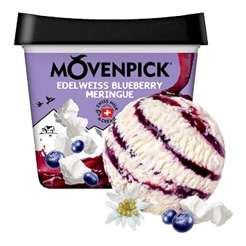 Ein beeriger Traum: Rahm-glace aus den Schweizer Alpen mit Edelweissgeschmack, Heidelbeersauce und Meringuestückchen. Mövenpick Blueberry Meringue, 900 ml 12.95