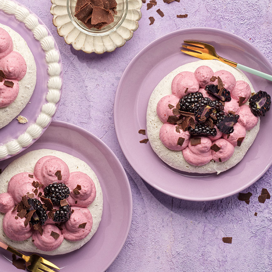 4. Anrichten: Mousse auf die Japonaisböden spritzen, mit den Brombeeren und Schokoladenspäne verzieren.